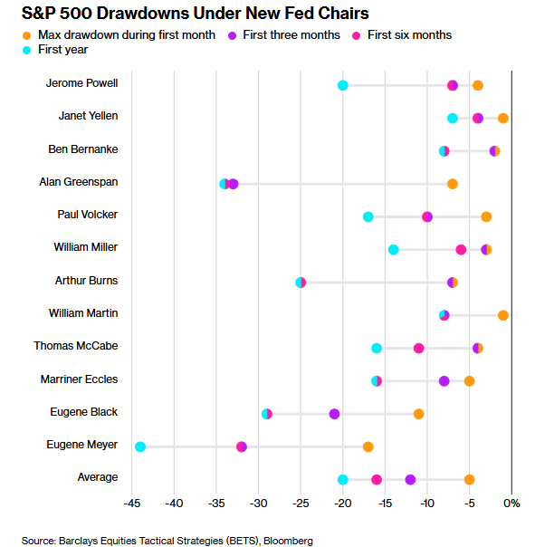 巴克莱 银行 全球股票战术策略主管Alexander Altmann整理的数据表明,自1930年以来,在美联储新主席上任后的一、三、六个月内,标普500指数平均的最大回撤幅度分别为5%、12%和16%。 此类回撤幅度均超过了标普500指数在任意随机选取年度内典型峰谷间的跌幅。