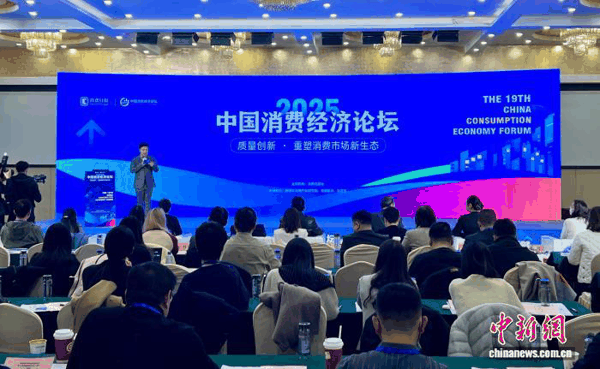2025年11月28日,由消费日报社等主办的第十九届中国消费经济论坛在北京举行,来自中国商业联合会、中国消费者协会等机构和消费行业的企业、媒体代表,共同聚焦“质量创新·重塑消费市场新生态”,从实践层面讨论应对消费变局的创新路径。图为论坛现场。潘旭临 摄
