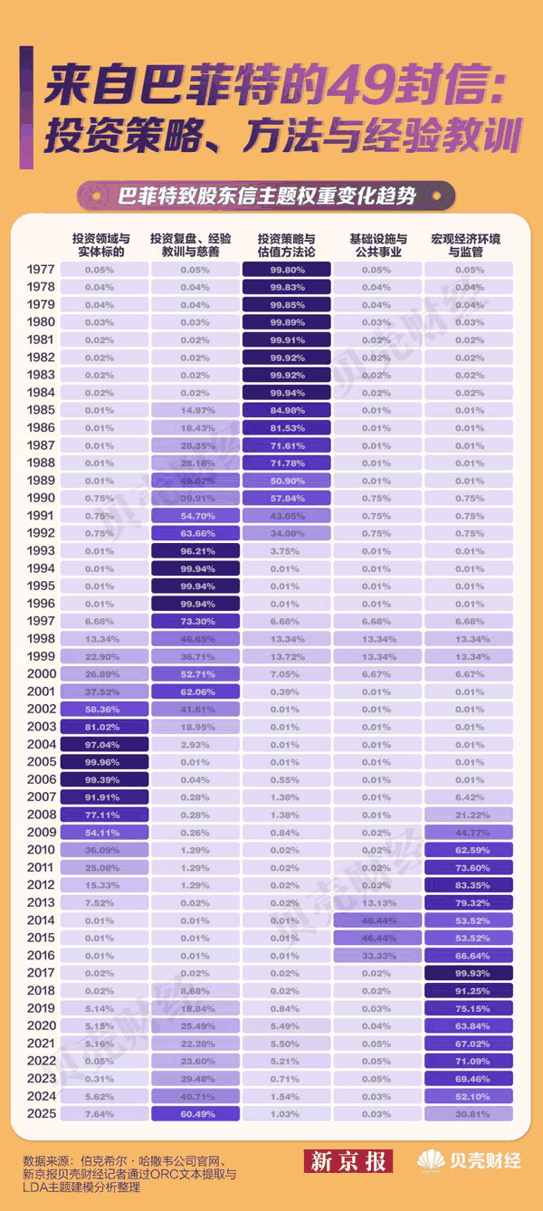 新京报 贝壳 财经记者梳理伯克希尔官网自1977年以来公开的49封致股东信发现,他使用频率最高的词并非“股市”,而是“商业”与“保险”。这些词与“盈利”“税”“资本”“价值”“市场”“股票”等高频词一起,勾勒出巴菲特长期关注的几条主线:投资理念、企业基本面与价值、伯克希尔的保险业务,以及他对长期合伙人查理·芒格的重视。