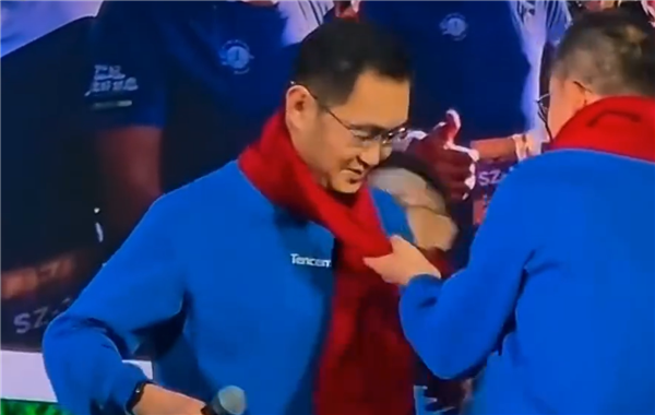 演唱过程中,总裁刘炽平还亲手为马化腾系上一条红色围巾,传递出温暖的新年寓意。