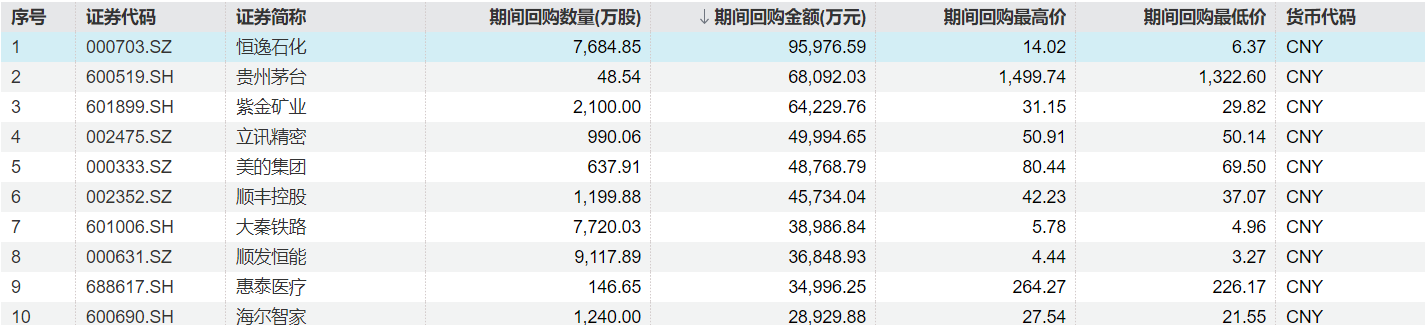 3月下旬以来A股回购金额排名前10企业。图片来源:Wind