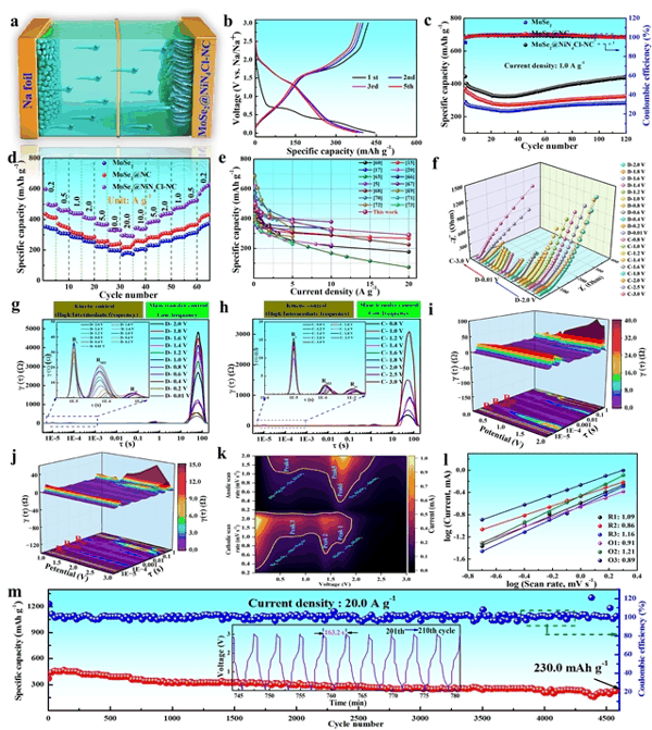 图4 . 全面的电化学评估。(a) 采用液体电解质的半电池装置示意图。(b) MoSe 2 @NiN 4 Cl-NC在1.0 A g -1 下的充放电电压曲线。(c) 所制备的三种MoSe 2 基样品在1.0 A g -1 下的循环耐久性和(d) 在不同倍率下的倍率性能评估。(e) MoSe 2 @NiN 4 Cl-NC与文献报道的先进MoSe 2 基负极的倍率依赖性可逆容量比较研究。(f) MoSe 2 @NiN 4 Cl-NC在初始循环期间通过原位EIS获得的动态奈奎斯特图。根据测得的阻抗数据计算的DRT图,用于MoSe 2 @NiN 4 Cl-NC在首次(g) 放电和(h) 充电过程中的分析。(i) MoSe 2 @NiN 4 Cl-NC在首次放电和(j) 充电过程中的三维DRT等高线图。(k) MoSe 2 @NiN 4 Cl-NC的扫速依赖性CV等高线图,可视化电流响应演化。(l) MoSe 2 @NiN 4 Cl-NC在六个不同氧化还原峰处的峰值电流(log(i))与扫描速率(log(v))的对数分析。(m) MoSe 2 @NiN 4 Cl-NC在20.0 A g -1 下的高倍率耐久性测试,插图为第201至210次循环的代表性GCD曲线。