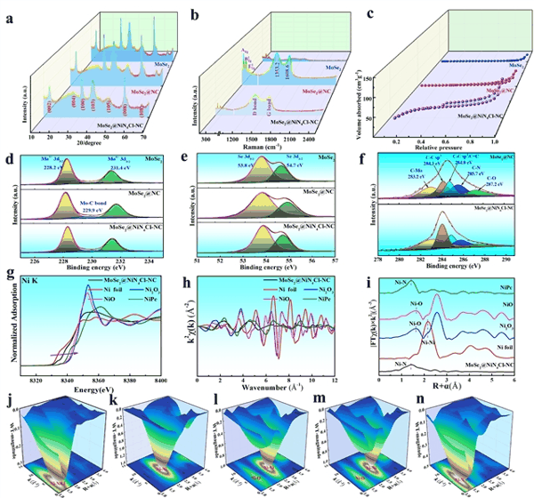 图2 . 结构与化学分析。所制备的三种MoSe 2 基样品的(a) XRD图谱,(b) 拉曼光谱,和(c) N 2 吸附/脱附等温线。三种MoSe 2 基样品的(d) 高分辨率Mo 3d,(e) Se 3d,和(f) C 1s XPS光谱。MoSe 2 @NiN 4 Cl-NC与四种参考样品的(g) Ni K-edge XANES光谱,(h) 拟合的EXAFS光谱,和(i) FT-EXAFS光谱。(j) MoSe 2 @NiN 4 Cl-NC,(k) Ni箔,(l) Ni 2 O 3 ,(m) NiO,和(n) NiPc在Ni K-edge处的小波变换等高线图。