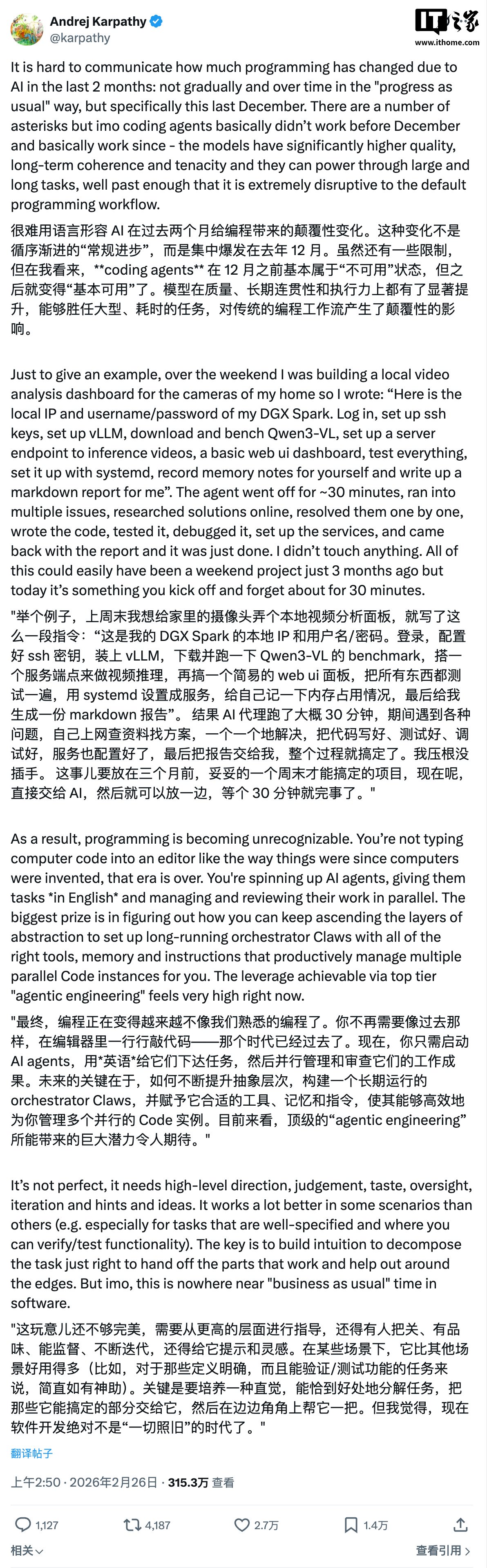 卡帕西在北京时间今天凌晨发布的 X 帖子中谈到,在去年 12 月之前,AI 智能体 几乎无法胜任实际开发任务 ,但随着模型质量提升和持续执行能力增强,智能体现在已经变得更加可靠。