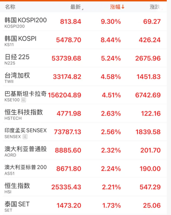 其中,韩国整个大盘指数已经逼近“涨停”,其中芯片制造商如三星 电子 和SK海力士涨幅均超过10%。日本股市暴涨2600点。