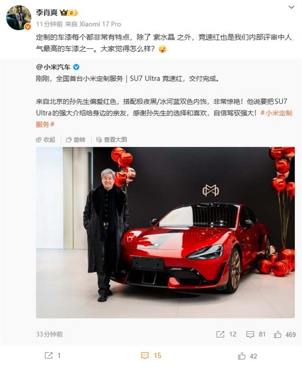 快科技1月9日消息, 小米汽车今天宣布,全国首台小米定制服务SU7 Ultra竞速红车型正式交付 ,来自北京的孙先生成为首位拥有该定制车型的车主。