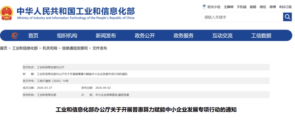 4月2日,工信部官网显示,工业和信息化部办公厅发布《关于开展普惠算力赋能中小企业发展专项行动的通知》(以下简称《通知》)。