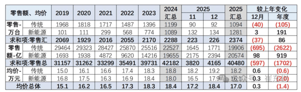崔东树表示,前期常规燃油车价格持续上升,市场萎缩在中低端很明显,而高端萎缩慢,因此从 2019 年的 15 万元上升到 2023 年的 18.3 万元。2025 年随着高端燃油车的较快萎缩,2025 年 1-12 月的均价降低到 18.2 万元,12 月 19.2 万元,燃油车购买群体买车逐步稳定。