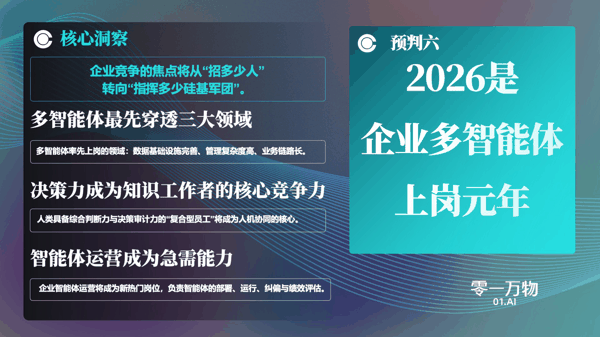 零一万物预测,智能体将从“一人一工具”进阶“一人一团队”,多智能体需具备TAB( 团队作战、业务裂变、商业重构)三要素,中国将成为全球多智能体“超级引擎”,“一把手工程”是赢取AI红利的关键路径,智能体反哺将开启数字基建“自主进化”,以及2026年是企业多智能体上岗元年。