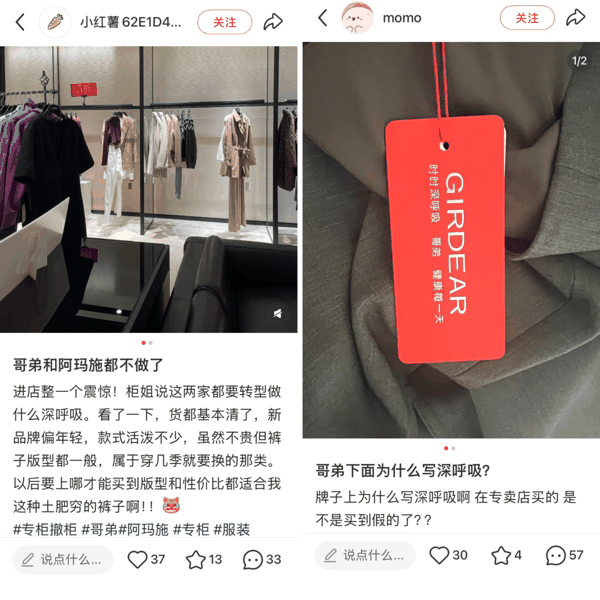 最近,不少女装消费者在社交平台上发出疑惑:她们所在城市的商场里原先开着的哥弟、阿玛施门店,如今都换成了一家名为“DEEP BREATH 深呼吸”的品牌。还有消费者发现,哥弟从2025年起推出的新吊牌上印着“时时深呼吸”几个字,深呼吸则在其吊牌上则印着“哥弟真的好”。
