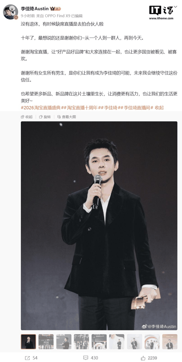 IT之家注意到,对于由此引发的一些网络传言,李佳琦随后在微博辟谣称: 没有退休,有时候缺席直播是去拍合伙人啦 。