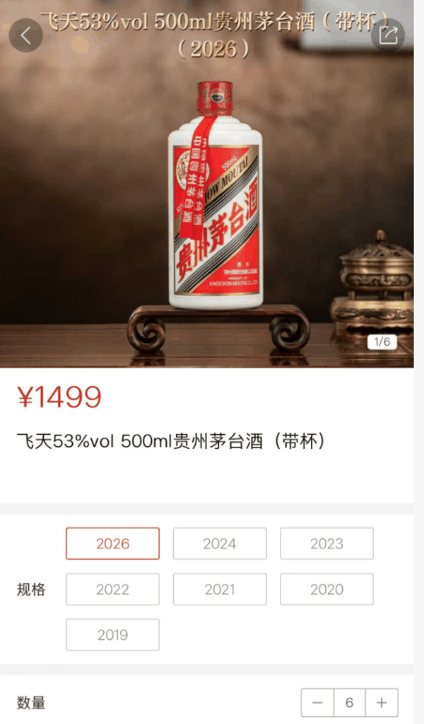 i茅台APP显示,2026年的飞天53%vol 500ml贵州茅台酒一瓶价格是1499元,其他年份的则需要加价购买,例如2024年的价格为1909元,2019年的则为2649元。
