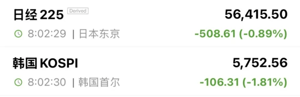 市场方面,亚太股指开盘下跌,截至发稿,日经225指数开盘下跌0.89%,报56415.5点;韩国KOSPI指数跌1.81%,报5752.56点。