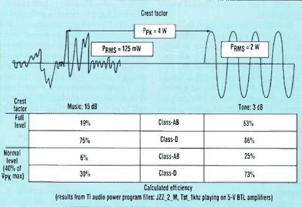 图1. 音乐的峰值因子远高于实验室效率测试中通常使用的正弦波或音调。在比较测试结果时,这一点非常重要,因为峰值因子显著影响音频输出放大器的功率效率,正如这些计算效率所示。