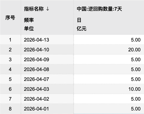 根据Wind统计数据,除4月3日、10日央行分别开展10亿、20亿元7天期逆回购操作外,其余工作日操作量均为5亿元。