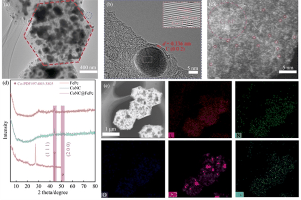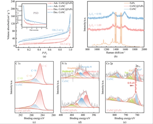 本研究采用两步法合成CoNC@FePc催化剂。首先,通过高温热解Co-ZIF前驱体获得CoNPs嵌入的氮掺杂碳基体(CoNC),其比表面积达106.2 m 2 /g,介孔结构有利于质量传输。随后,通过溶液浸渍法将FePc分子锚定于CoNC表面,形成了CoNPs与FePc的紧密界面。透射电镜(TEM)与球差校正高角环形暗场扫描透射电镜(AC-HAADF-STEM)表征显示,CoNC@FePc保留了前驱体的六方结构,CoNPs与FePc分子均匀分布于碳基体中。X射线光电子能谱(XPS)分析表明,FePc的引入诱导Co 2p 3/2 结合能正向偏移了0.9 eV,证实Co与FePc间存在显著的电荷转移,优化了活性位点的电子环境。