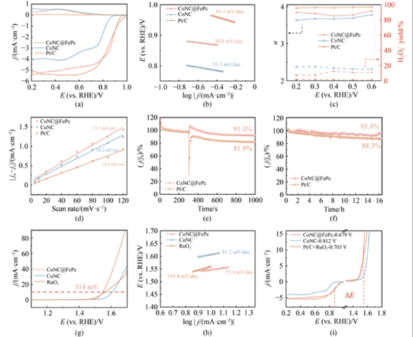 电化学性能测试显示,CoNC@FePc在0.1 M KOH电解液中表现出优异的ORR/OER双功能活性。旋转环盘电极(RRDE)测试表明,其ORR半波电位与扩散极限电流密度均超越了Pt/C,Tafel斜率显著低于CoNC,表明其具有更快的反应动力学。此外,CoNC@FePc的OER过电势较RuO 2 降低了17 mV,且双功能电压间隙优于Pt/C+RuO 2 组合。耐久性测试中,由于CoNPs的稳定锚定与碳基体的抗腐蚀特性,CoNC@FePc在16小时恒电位运行后电流保持率达95.4%,甲醇耐受性较Pt/C提升了2倍。