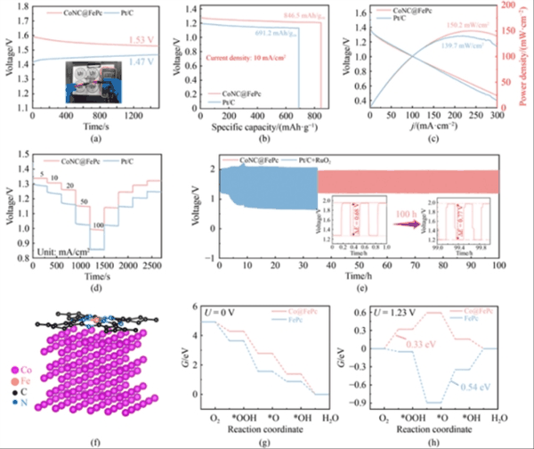 为验证其实际的应用潜力,研究人员组装了CoNC@FePc基的锌空气电池(ZAB)。结果显示,其开路电压达1.53 V,峰值功率密度为150.2 mW/cm 2 ,较Pt/C基电池提升了 7.5 %。在10 mA/cm 2 电流密度下循环100小时后,充放电电压间隙仅增加了0.747 V,显著优于Pt/C+RuO 2 体系。根据密度泛函理论(DFT)计算进一步揭示了该过程的催化机制:CoNPs与FePc的界面电子转移降低了O→OH转化的能垒,使ORR速率决定步骤(RDS)能垒较纯FePc降低了39%;同时,CoNPs促进了OH→O的脱质子过程,将OER的RDS能垒从0.84 eV降至0.44 eV,揭示了双金属协同效应的原子级起源。