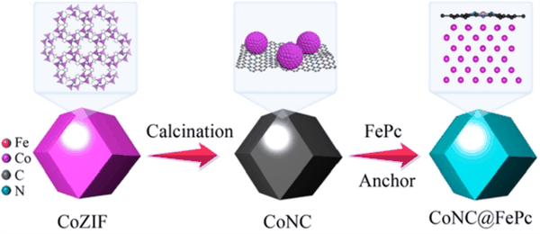 随着化石能源的枯竭与环境污染的加剧,开发高能量密度、可再生的锌空气电池(ZAB)成为能源领域的研究热点。然而,ZAB的氧电极反应动力学缓慢及催化剂稳定性不足,严重制约了其商业化进程。传统贵金属催化剂(如Pt/C、RuO 2 )虽然活性优异,但高昂的成本与耐久性的缺陷限制了其大规模应用。近年来,金属-氮-碳(M-N-C)单原子催化剂因其高原子利用率与可调电子结构备受关注,但分子催化剂的负载稳定性与活性位点暴露仍面临挑战。金属有机框架(MOF)衍生的碳基材料具有高比表面积与均匀的金属分散特性,为负载分子催化剂提供了理想载体。本研究旨在通过ZIF-67热解构建钴纳米颗粒(CoNPs)嵌入的氮掺杂碳基体(CoNC),并锚定FePc分子,实现活性位点的高效暴露与电子结构的协同优化,从而开发低成本、高稳定性的双功能氧催化剂。