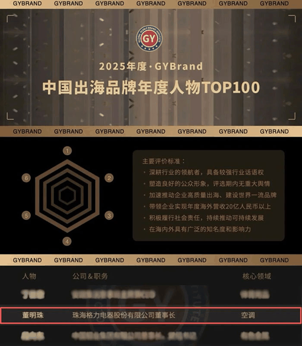 近日,品牌评估机构GYBrand全球品牌研究院发布《2025中国出海品牌年度人物TOP100名单》,格力电器董事长董明珠荣耀入选。