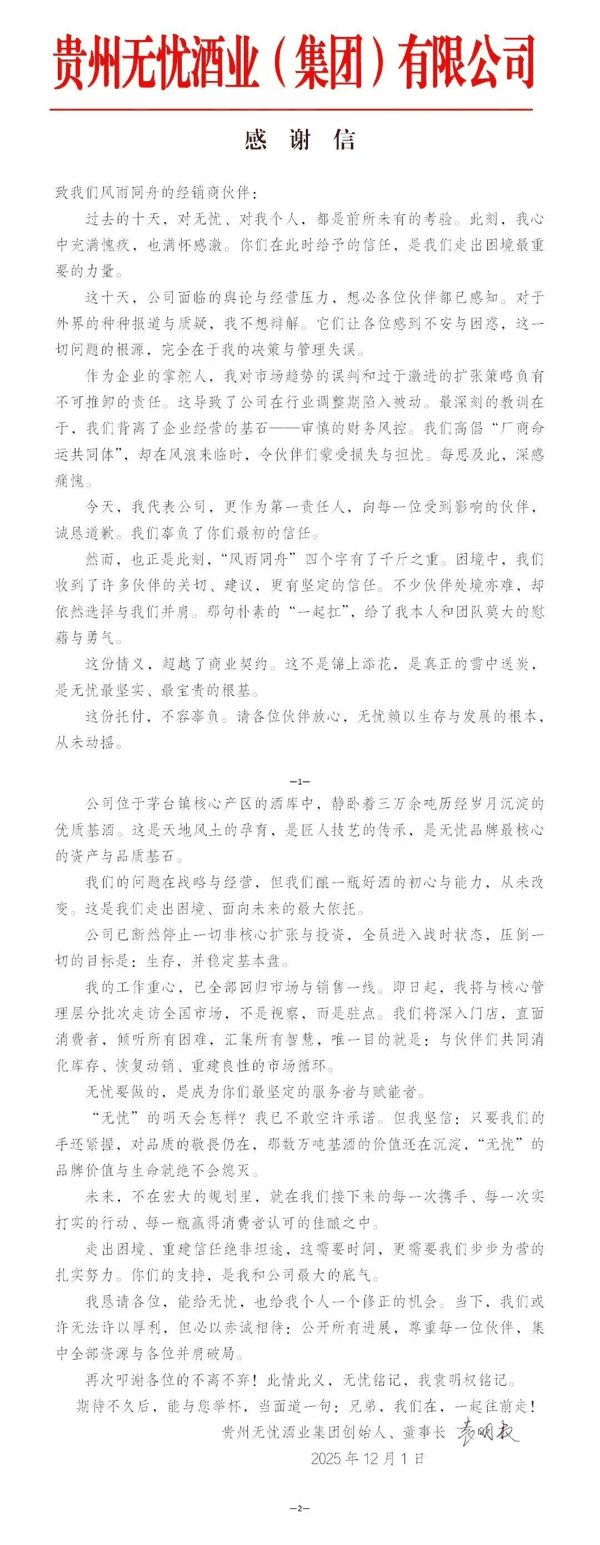 在公开信中,袁明权亦坦承无忧酒业的现状困境,同时承认了自己的过失。“作为企业的掌舵人,我对市场趋势的误判和过于激进的扩张策略负有不可推卸的责任。这导致了公司在行业调整期陷入被动。”