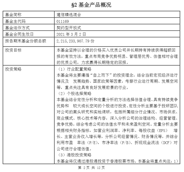 建信臻选混合的基金合同生效日为2021年3月2日,基金投资目标为:坚持以合理的价格买入优质公司并长期持有持续获得超额回报的有效方法,重点布局竞争优势明显、管理层优秀、估值相对合理的优质公司,力求赢得长期稳定的回报。