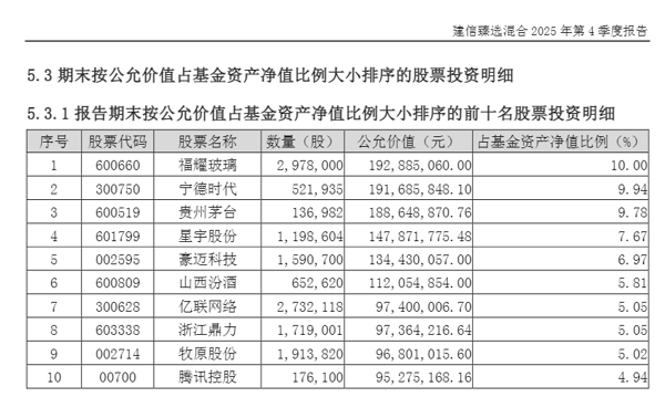 近日披露的基金2025年四季报显示,基金持股集中度较高,重仓股包括福耀玻璃、宁德时代、贵州茅台等企业。