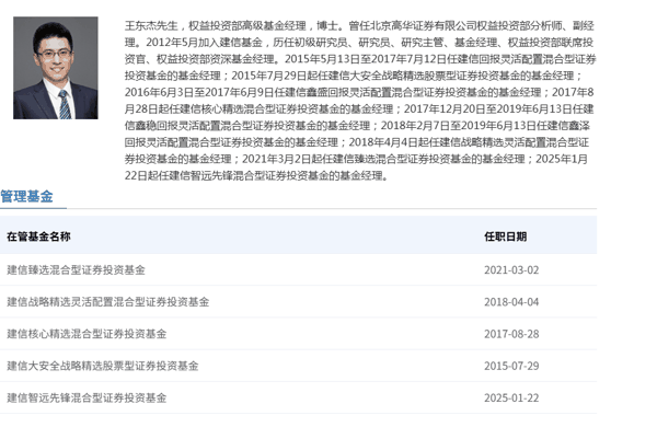 建信臻选混合的基金经理为王东杰,2012年5月加入建信基金,历任初级研究员、研究员、研究主管、基金经理、权益投资部联席投资官、权益投资部资深基金经理。