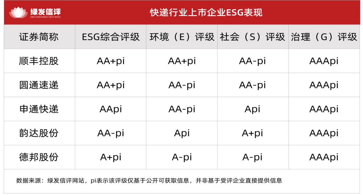绿发信评主动评级结果显示,快递行业ESG发展整体态势向好,5家上市公司评级结果均在A+pi及以上,其中 顺丰控股 、 圆通速递 以AA+pi评级位居第一梯队,凭借全链路绿色布局与数字化优势领跑行业; 申通快递 获AApi评级、 韵达股份 获AA-pi评级,构成第二梯队; 德邦股份 获得A+pi评级。