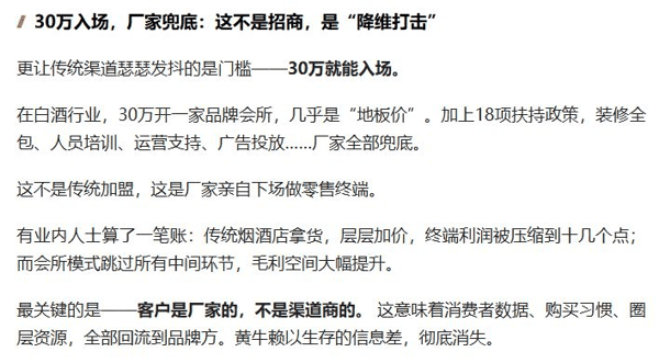《每日经济新闻·将进酒》记者注意到,上述在市场流传的文章写道:“30万入场,厂家兜底:这不是招商,是‘降维打击’。有业内人士算了一笔账:传统烟 酒店 拿货,层层加价,终端利润被压缩到十几个点;而会所模式跳过所有中间环节,毛利空间大幅提升。最关键的是——客户是厂家的,不是渠道商的。 这意味着消费者数据、购买习惯、圈层资源,全部回流到品牌方。黄牛赖以生存的信息差,彻底消失。”