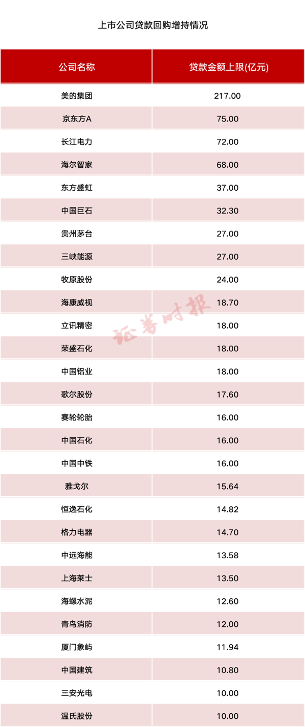 在行业龙头的引领示范作用下,今年以来,上市公司借助贷款开展回购或增持活动的热情高涨。截至目前,已有56家上市公司披露使用贷款进行回购或增持的计划,其金额上限累计高达318.65亿元。