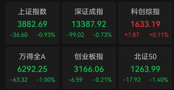 上午收盘,上证指数下跌0.93%,深证成指下跌0.73%,创业板指下跌0.21%,科创综指上涨0.11%。