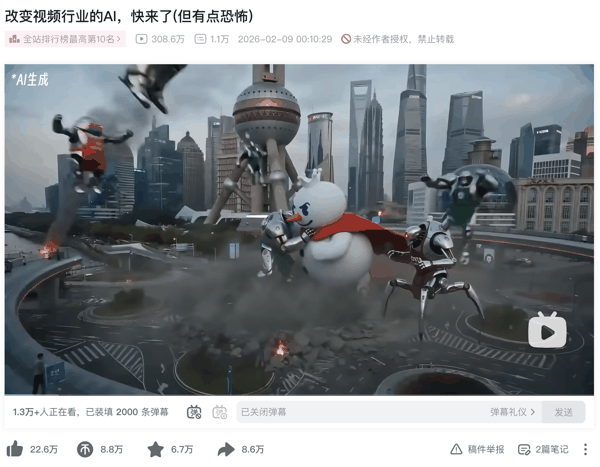 2月9日,先是视频内容领域头部创作者“影视飓风”发布了一条视频,用一些demo展示并解读了Seedance 2.0的技术进展,从创作者视角对其效果实现表达了惊叹与认可。这当中伴随一些十分有冲击力的结论,例如 传统影视制作流程已经被判 “ 死刑 ”,行业进入“ 被AI海啸冲走的倒计时”。