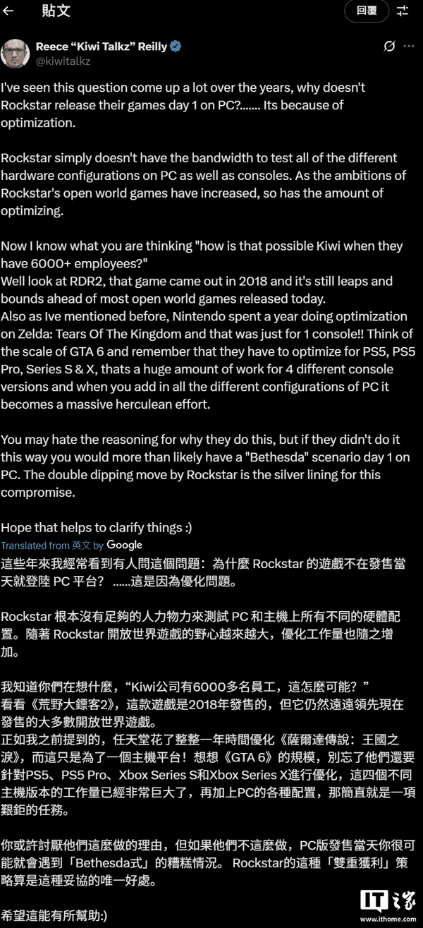 IT之家 11 月 17 日消息,消息人士 Reece “Kiwi Talkz” Reilly 上周(11 月 14 日)在 X 平台发文,分析 R 星旗下游戏为何要独占一年才登陆 PC 平台。