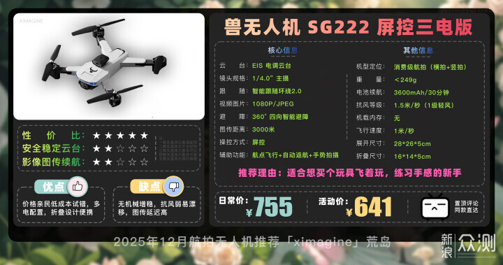 欢迎来到2025年12月航拍无人机推荐合集!我是「ximagine」每个人想飞的原因都不一样,有人是为了圆儿时的飞行梦,有人是为了旅行发个朋友圈,还有人是想靠它拍大片。但残酷的现实是,很多人买无人机之前根本没想好要拿它干什么,结果要么买了个几千块的高端货在柜子里吃灰,要么买了个几百块的工业垃圾飞一次就退坑。为了帮大家理清思路,分享我总结的三个选购逻辑。关于稳定性,如果你想出片机械云台是物理防抖的基础,电子防抖都是通过裁切画面实现,画质损失很大。关于图传,空旷的野外飞 5 公里和在有干扰的城市里飞 500 米,对图传的要求是完全不同的,信号的抗干扰能力才决定了敢不敢飞,毕竟提控回家是所有飞手的噩梦。关于便携与抗风的矛盾,249g 小飞机好带还不用申报,但在海边或山顶,它的抗风能力就是物理硬伤,大飞机稳画质好,但每次出门背着它都是个负担,需要在这两者之间做一个取舍。基于以上逻辑,我按照价格和对应的用途将 18 款无人机分成三组,1000 元以内适合想低成本体验飞行乐趣, 1000 到 5000 元适合旅行记录和家庭拍摄,5000 元以上适合有商业拍摄对高画质有要求,没有完美的机器,只有适合自己的,话不多说,正餐开始! <1000元