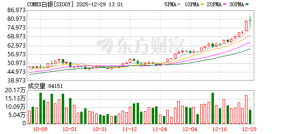 12月份,白银价格大幅飙升,这是 贵金属 市场整体火爆行情的一部分。 周一亚市交易时段,现货白银一度涨超5%,站上83美元/盎司上方,继续刷新历史新高。 截至目前,现货白银报81美元,日内上涨逾2%,为连续第六个交易日上涨。