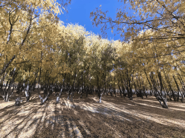 青藏高原旱柳。氮磷添加后延长了其生长季,绿色为氮磷添加处理组,黄色为没有任何添加的对照组。受访者供图