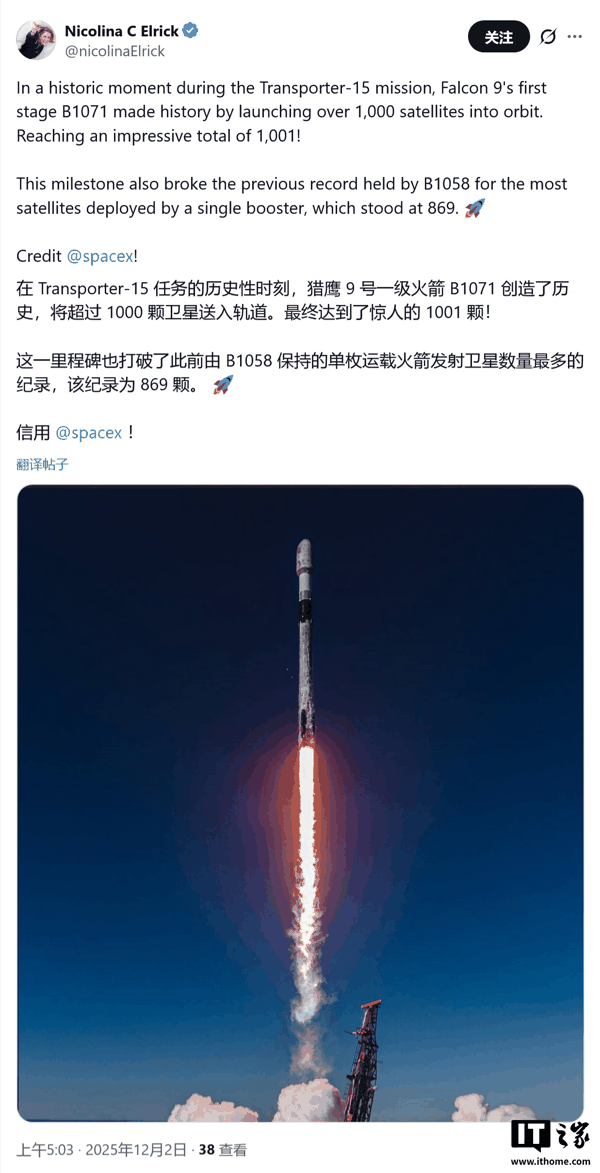 IT之家 12 月 2 日消息,科技媒体 teslarati 昨日(12 月 1 日)发布博文,报道称 SpaceX 再次刷新航天复用纪录,其代号为 Transporter-15 的任务不仅成功将 140 颗航天器送入轨道, 更核心的成就是一级助推器 B1071 完成了第 30 次飞行与回收,并将 1001 颗卫星送入轨道。