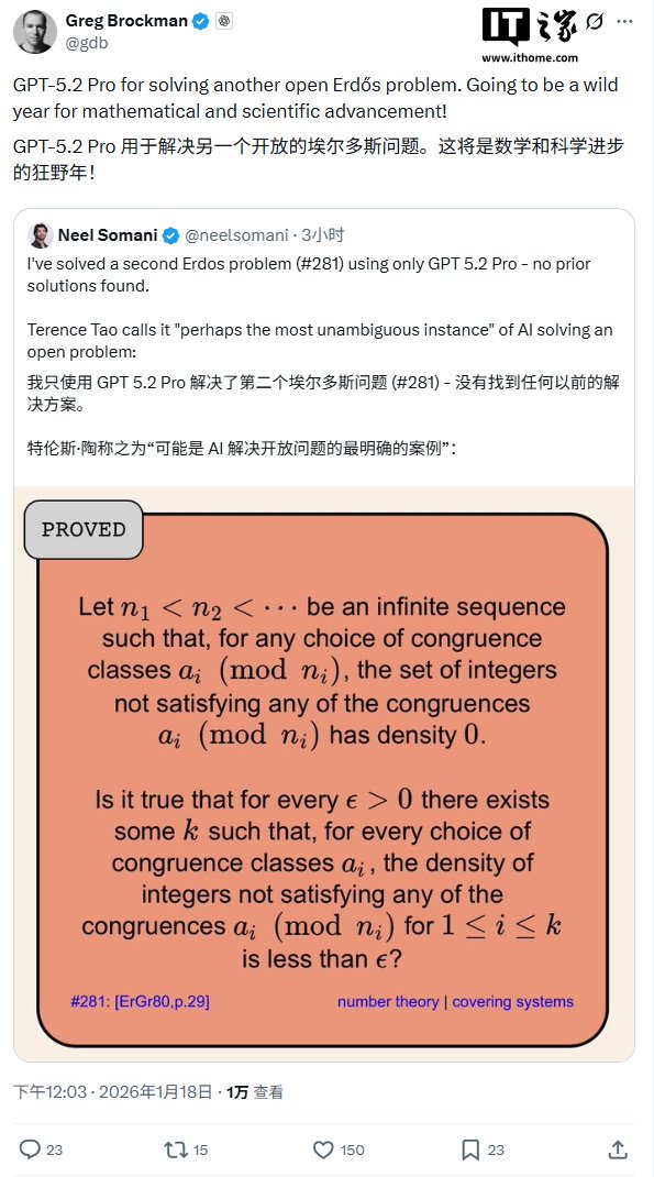 IT之家 1 月 18 日消息,Eclipse 创始人 Neel Somani 今日在 X 上发文称,他使用 GPT-5.2 Pro 破解了另一个著名的 Erdős(埃尔德什)难题。