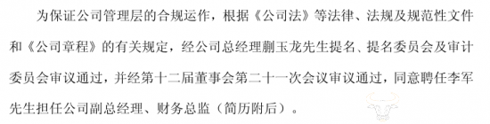 近日,妙可蓝多核心管理层发生人事调整,李军获聘为公司副总经理兼财务总监。