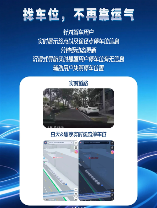 该功能会结合用户所在位置,对周边的停车位信息进行高效筛选, 可以实时看到道路路边停车位情况 ,还原真实世界中的车位情况,用户不用再碰运气找车位了。