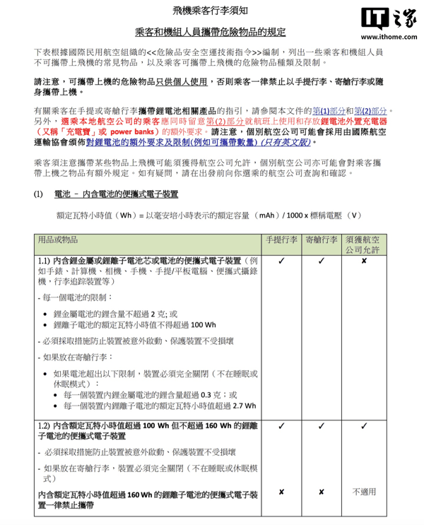 IT之家 3 月 30 日消息,据香港民航处,因响应国际民用航空组织(ICAO)3 月 27 日发布的关于旅客携带和使用锂电池外置充电器的最新规定, 香港国际机场即日起仅允许民航乘客最多只能携带两个充电宝(移动电源)上飞机,而且不得在飞行途中为充电宝充电 。