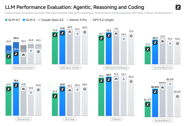 GLM-5定位为当下顶尖的Coding编程模型,整体性能较上一代提升20%。