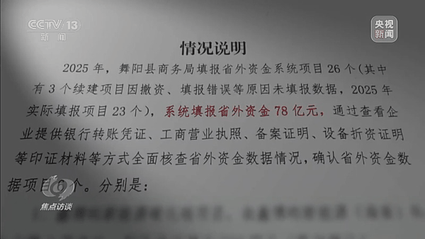 省外资金,简单来说就是从本省以外地区引进来的投资资金。2000年前后,我国多地开始将引进省外资金作为推动区域发展的重要抓手,一些省份将引进省外资金作为加快发展的关键举措,开始建立省外资金统计通报与排名机制,省际围绕项目、资源、政策展开激烈竞争。在这一过程中,部分地方出现了省外资金统计严重失真失实的情况。2025年1月到11月,河南省漯河市舞阳县上报省外到位资金78亿元,但当记者调查时,当地承认实际到位金额仅为1亿多元。