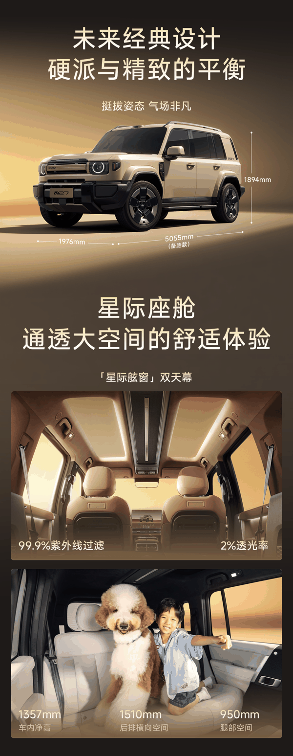 车身尺寸方面,新车 长宽高分别为 4909*1976*1855/1894mm,轴距为 2910mm 。另外,新车采用竖向排列尾灯组,配备侧开尾门、外挂式备胎和粗壮的后保险杠。