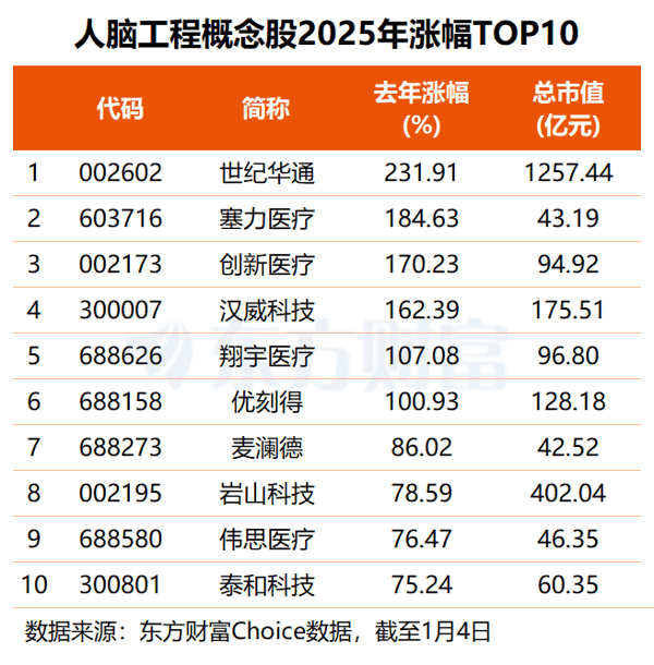 从去年的市场表现来看,32只 人脑工程 概念股实现股价上涨,占比超八成。其中, 世纪华通 以231.91%的涨幅居首, 塞力医疗 、 创新医疗 、 汉威科技 、 翔宇医疗 、优刻得的年度涨幅均超1倍, 麦澜德 、 岩山科技 、 伟思医疗 等10股的区间涨幅也在50%以上。