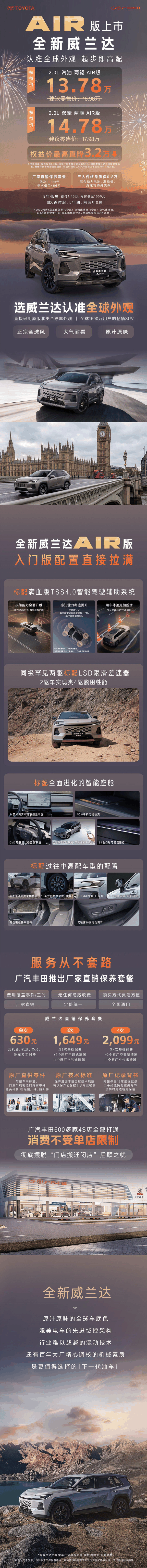广汽丰田全新威兰达AIR版SUV车型上市,权益价13.78万元起