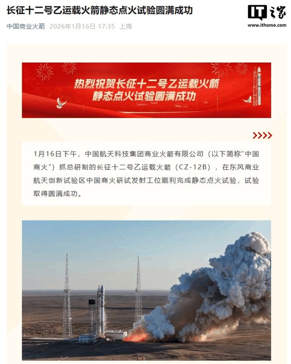 IT之家 1 月 16 日消息,今天下午,中国航天科技集团商业火箭有限公司(以下简称“中国商火”)抓总研制的长征十二号乙运载火箭(CZ-12B),在东风商业航天创新试验区中国商火研试发射工位顺利完成静态点火试验, 试验取得圆满成功 。
