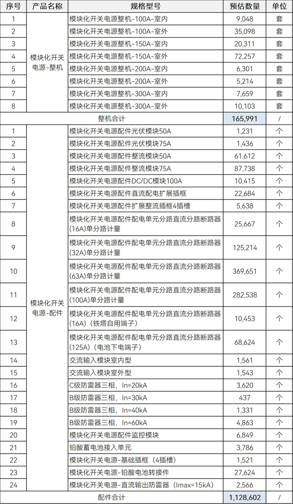 模块化开关电源配件:包括光伏模块(50A/75A)、整流模块(50A/75A)、DC/DC模块100A、各类直流分路断路器、防雷器、监控模块及基础插框等,预估采购总量为1,128,602个。