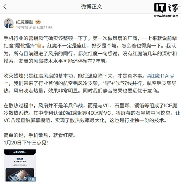 IT之家 1 月 15 日消息,红魔游戏手机产品总经理姜超今日发文称, 手机行业的营销风气确实该整顿一下了 ,第一次做风扇的厂商,一上来就说前辈红魔“隔靴搔痒”。红魔不一定是座山,好歹是个坡,怎么着也得爬一下。